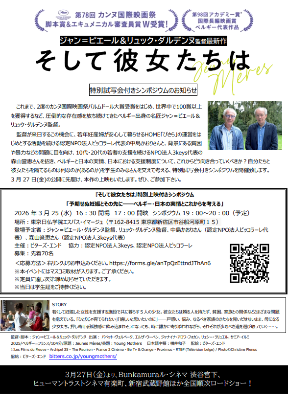 映画『そして彼女たちは』を制作したジャン=ピエール&リュック・ダルデンヌ監督が来日されるこの機会に、ベルギーと日本の実情、日本における支援制度について、これからどう向き合っていくべきか?自分たちと彼女たちを隔てるものは何なのか(あるのか)を学生のみなさんを交えて考える、特別試写会付きシンポジウムを開催します。 3月 27日(金)の映画公開に先駆け、本作の上映もいたします。